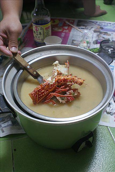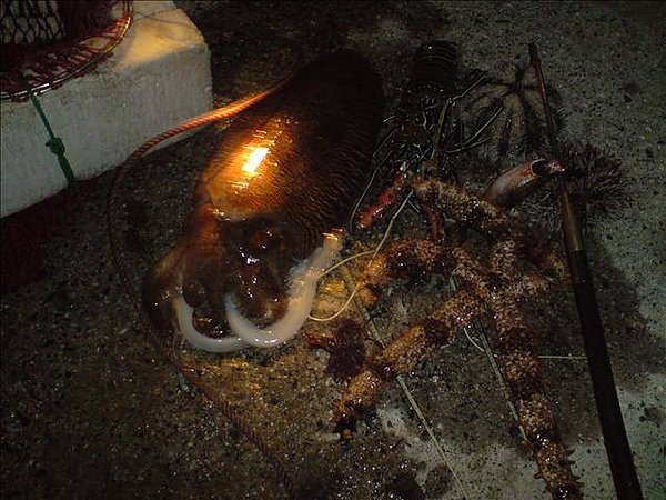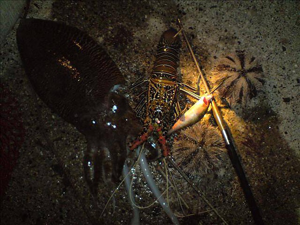 烏賊真的很誇張大喔,約莫兩斤。那龍蝦.....在水裡看很大!!!出水面才知道不是太大....(不過有戰績總是好的!)